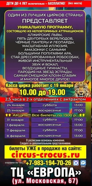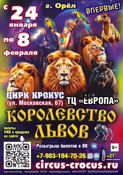 15 января 2026 года ВНИМАНИЕ! Акция для членов профсоюзов! С 24 января по 8 февраля в Орле вас ждет цирк «Крокус». Один из лучших цирков страны подготовил для вас уникальную шоу-программу «Королевство Львов». Над шоу трудятся профессионалы: прославленные хореографы, композиторы и режиссёры-постановщики с мировым именем. В программе: - аттракцион «Алжирские львы; Членам профсоюзов предлагается приобрести билеты на представления со скидкой 50% в секторе В и Г ряд 7 и 6 (только в кассе цирка и при предъявлении профсоюзного билета, дисконтной карты члена профсоюза или иного документа, подтверждающего членство в профсоюзе). Также члены профсоюзов Орловской области для получения скидки могут воспользоваться промокодом в онлайн-кассе цирка — «ФПОО». При входе с онлайном билетом потребуется предъявить профсоюзный билет или иные документы, подтверждающие членство в профсоюзе. Билеты в онлайн продаже: circus-crocus.ru Дети до 4-х лет (включительно) бесплатно. Без предоставления отдельного места. Купол цирка и касса расположены возле ТЦ «Европа» (г. Орел, ул. Московская, 67). Касса открыта с 19 января с 10:00 до 19:00 ежедневно. Справки по телефону: +7 (983) 194-70-26 ![]() ![]() |